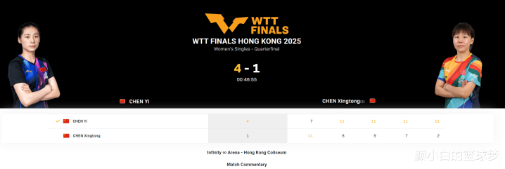 2025年WTT香港总决赛女单1/4决赛,陈幸同1-4惨败陈熠止步八强,五局比分:11-7、8-11、9-11、7-11、2-11,可以说世界第三这场比赛是一败涂地,陈熠目前的世界排名是第九,陈幸同再一次被爆冷。