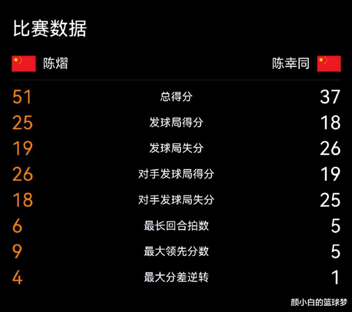 大家看这个数据就能知道陈幸同这场比赛有多离谱,对手发球局失分25,发球局失分26,陈幸同完完全全被陈熠吊打。